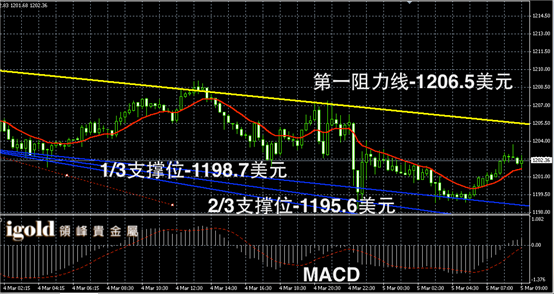黄金阴阳烛录得柱体收短,整体处于红色日均线中位,短线MACD显示呈中性,黄金价格上午或在1200美元附近横盘运行,低位建议首先参考1198美元附近,若跌破空头或增加,高位阻力可分阶段参考1204和1207美元附近。