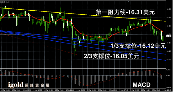 白银阴阳烛录得后期柱体低于红色日均线,离散率增加,短线MACD显示弱势空头主导,白银短线低位支撑可首先参考16.15美元附近,若跌破空头或扩大至16.05美元附近。高位若重回16.25美元附近,多头或持稳。