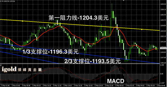 技术回顾:昨晚的评论中,我们给出了具体的运行区间,并且指出金价低位支撑首先参考1199美元,并且预测若突破1204美元,可小幅看涨,这些判断都与昨晚的走势相符。