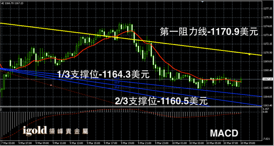 黄金阴阳烛录得后期阴烛回落,后期柱体处于红色日均线中位,短线MACD显示呈中性,黄金价格短线或偏于向1170美元附近攀升,低位支撑可分阶段参考1165和1163美元附近支撑。