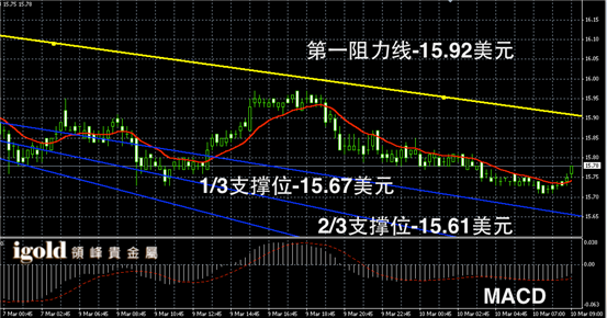 白银阴阳烛录得柱体低于红色日均线,后期小幅高于红色日均线,短线MACD显示弱势空头主导,白银价格上午偏于向15.85美元附近回升。