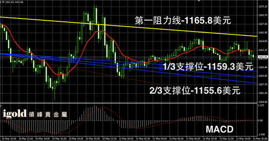 黄金阴阳烛录得高低交叉于红色日均线中位,柱体较短,短线MACD显示呈中性,晚上8点前,或继续在1162美元附近横盘运行,低位支撑若跌破1159美元或向1156美元附近下行,高位突破1166美元前不建议大幅做多。