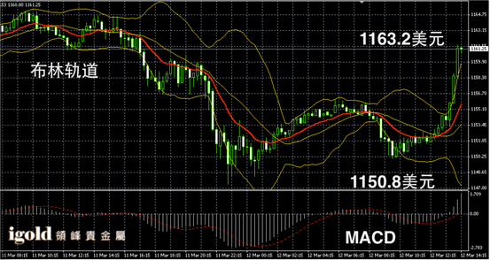黄金阴阳烛录得短线阳烛大幅增加,后期高于红色日均线,布林轨道录得区间扩大,短线MACD显示弱势多头主导,金价短线或在1160美元附近持稳,高位若突破1163美元或继续上探,低位支撑可首先参考1156美元附近。