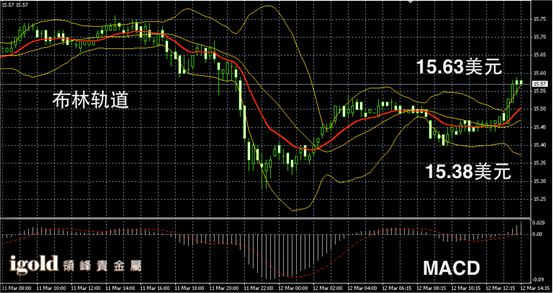 白银阴阳烛录得后期柱体小幅高于红色日均线,布林轨道区间小幅上探,短线MACD显示弱势多头主导,白银价格午后或在15.54美元附近持稳,高位若突破15.65美元可小幅看涨,低位支撑可首先参考15.45美元附近。