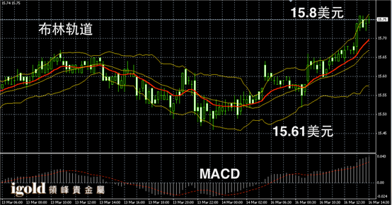 白银阴阳烛录得连续阳烛,且高于红色日均线,布林轨道录得区间上升,短线MACD显示多头主导,白银价格午后或向15.7美元附近回落,高位若突破15.8美元,可继续小幅看涨。