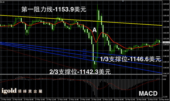黄金阴阳烛录得波动运行后,末端柱体收短,整体处于红色日均线中位,短线MACD显示呈中性,上午黄金价格或小幅上探1152.6美元附近,低位支撑可首先参考1146美元附近,整体运行区间可参考阳烛A的高低价。