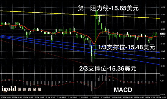 白银阴阳烛末端录得阳烛小幅增多,短线MACD显示呈中性,整体柱体较短,短线白银价格或向15.63美元附近攀升,低位支撑可首先参考16.5美元附近。