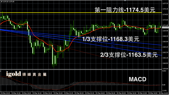 黄金阴阳烛录得柱体较短,整体处于红色日均线中位,短线MACD显示呈中性,黄金价格晚上8点前或继续在1170美元附近徘徊,之后可留意1168、1166和1173美元附近点位,分别作为空头和多头的参考信号。