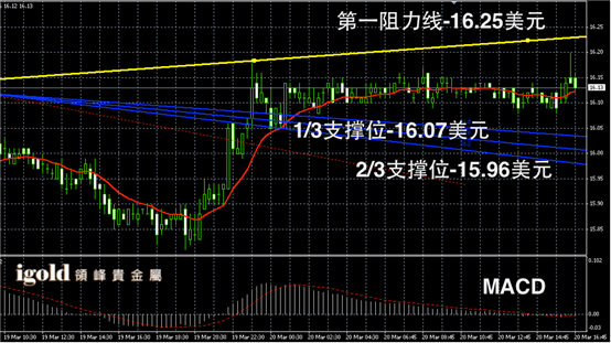 白银阴阳烛录得聚焦明显,整体处于红色日均线中位,短线MACD显示呈中性,白银价格晚上或继续在16.13美元附近震荡,运行区间可参考16.05-16.2美元区间,高低若有突破可顺势看涨看跌。