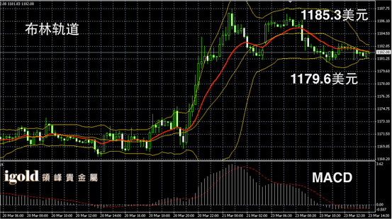 黄金阴阳烛录得小幅下探后,柱体收短,布林轨道区间收窄,短线MACD显示呈中性,黄金价格午后或在1181美元附近横盘运行,低位空头信号可首先参考1179美元附近,多头突破1184美元前不建议大幅看涨。