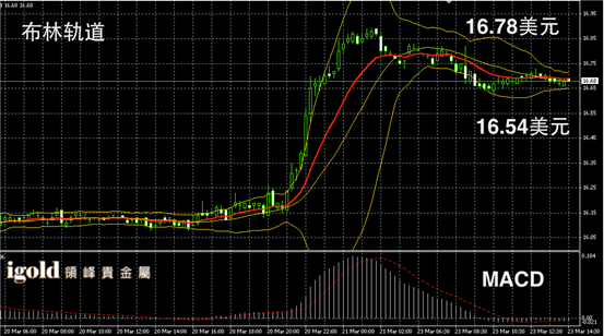 白银阴阳烛录得不断下探,后期柱体处于红色日均线中位,布林轨道录得区间收窄,白银价格午后或在16.65美元附近徘徊,短线运行区间可参考16.6-16.7美元区间,高低若有突破可顺势看涨看跌。