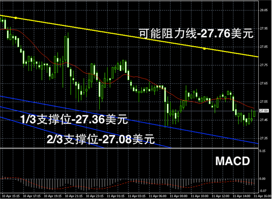 白银阴阳烛录得柱体低于红色日平均移动线,且整体录得阴烛较短,短线MACD显示弱势空头主导,预期未来或继续小幅震荡下行。