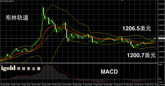 黄金阴阳烛录得聚焦明显,整体处于红色日均线中位,布林轨道区间收窄,短线MACD显示呈中性,黄金价格午后或继续在1203美元附近徘徊,下午4点左右,建议留意1207和1198附近点位,若有突破可小幅看涨看跌。