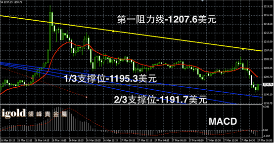 黄金阴阳烛录得后期柱体小幅回落,低于红色日均线中位,短线MACD显示弱势空头主导,黄金价格晚上8点前后,建议参考1196美元附近作为空头信号,跌破或继续下探,多头信号可分阶段参考1203和1205美元附近。