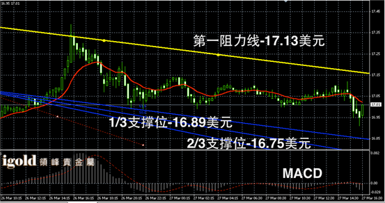 白银阴阳烛录得柱体小幅低于红色日均线,短线MACD显示弱势空头主导,白银价格或在17美元附近横盘运行,低位支撑建议参考16.9美元附近,多头突破17.1美元前不建议大幅做多。