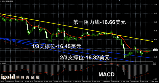 白银阴阳烛录得阴烛回落后,末端阳烛小幅攀升,短线MACD显示空头主导,白银价格或在16.5美元附近小幅徘徊,晚上8点前后,建议留意16.45美元附近支撑,若跌破空头或增加,高位多头信号可参考16.6美元附近。