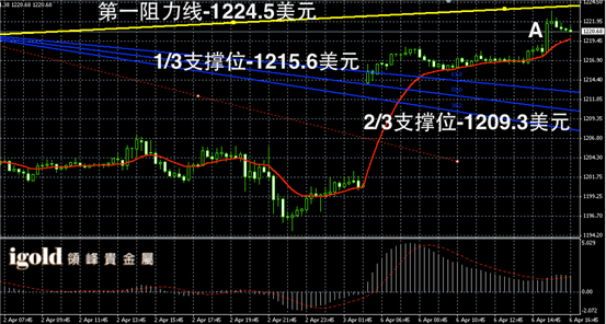 黄金阴阳烛录得阳烛反弹,末端柱体高于红色日均线,短线MACD显示弱势多头主导,黄金价格晚上或小幅回调,8点前后,建议留意阳烛A的最低价,若跌破空头或增加,高位多头信号可参考1223美元附近。