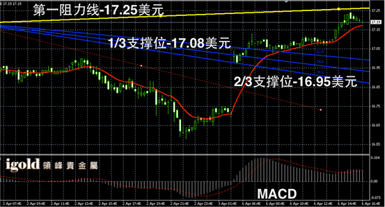 白银阴阳烛录得阳烛小幅增加,后期高于红色日均线,短线MACD显示弱势多头主导,白银价格或首先围绕17.2美元附近运行,晚上8点前后,建议留意17.1美元附近支撑,若跌破或向17美元附近滑落,高位多头信号可参考17.25美元附近。