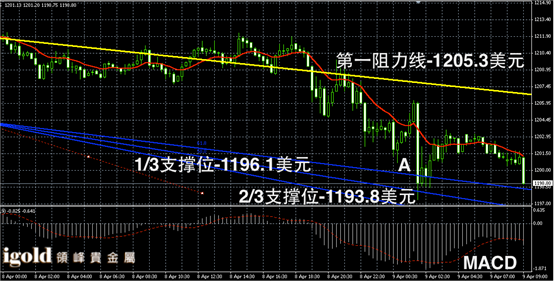 黄金阴阳烛录得后期阴烛增加,且低于红色日均线,短线MACD显示弱势空头主导,黄金价格上午或继续偏空,低位若跌破阴烛A的最低价附近,空头或大幅增加,高位突破1203美元前不建议大幅做多。
