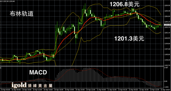 黄金阴阳烛末端录得小幅回落,布林轨道区间下探,短线MACD显示弱势空头主导,黄金价格午后或小幅上探1205美元附近,下午4点左右,美指若再次上探99.6附近,金价或承压回落,低位支撑建议密切留意1200美元附近。