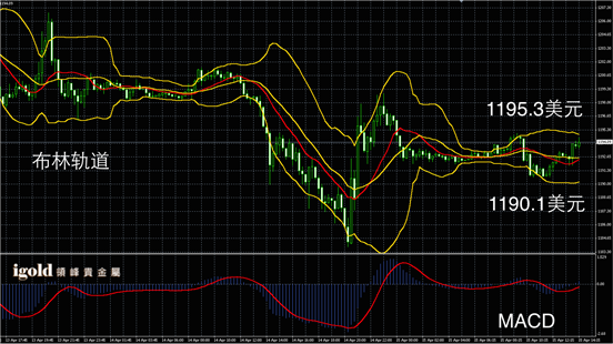 黄金阴阳烛录得高低交叉于红色日均线中位,布林轨道整体区间收平,短线MACD显示多空反复,黄金价格午后或继续在1193美元附近徘徊,高低若有突破布林轨道区间,可顺势看涨看跌。