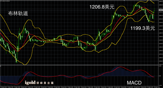 黄金阴阳烛录得反弹后回落,后期柱体处于红色日均线中位,短线MACD显示呈中性,布林轨道暂时收平,午后黄金价格或整体持稳在1203美元附近,并偏于上探1205美元附近,下午4点左右建议留意美指反弹和空头回击。