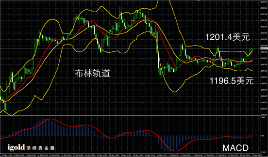 黄金阴阳烛录得柱体平均分布在红色日均线中位,布林轨道区间收平,短线MACD显示呈中性,黄金价格午后或向1203美元附近上探,高位若突破1206美元附近,多头或扩大,低位空头信号可参考1196美元附近。