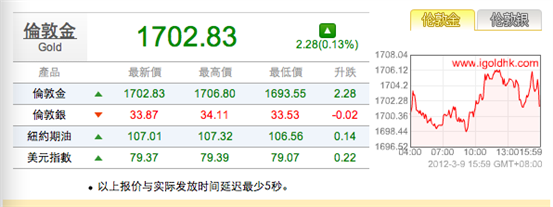 今日概括:今天上午10点左右希腊债券置换率达95%,顺利通过,因此导致欧元兑美元短暂上升,美指下降。所以金银价格上午一路上涨,中午12点左右达日内新高。黄金价格达日内最高价1706.8美元,国际白银价格达日内新高34.11美元/盎司。黄金价格日线浮动仍旧在1700 – 1703美元区间,白银价格日线浮动在33.8美元附近。金银价格继续上行遭遇阻力,未来市场或偏于稳定,继续小幅震荡。