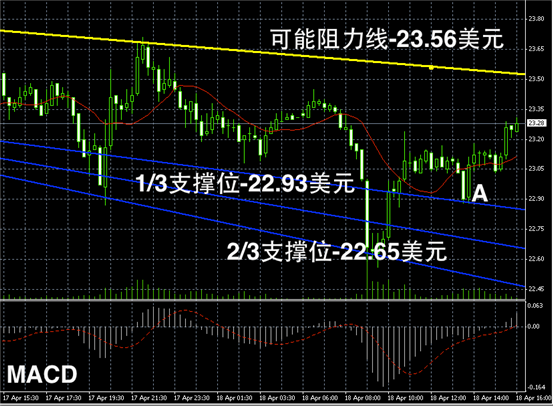 白银阴阳烛下行后出现反弹,不过反弹力度较弱,后期柱体整体处于红色日平均移动线上方,短线MACD空头开始转为多头积聚,预期未来或窄幅上行。低位支撑可首先参考阳烛A的最低价。