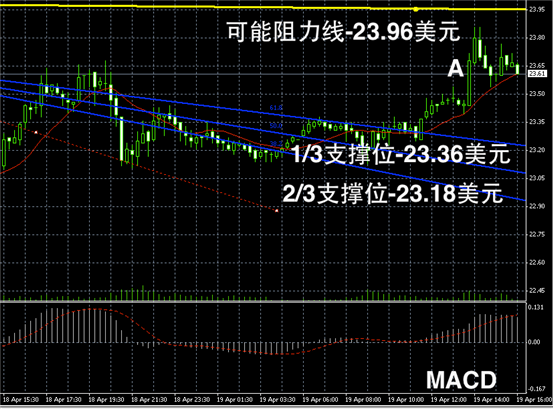 白银阴阳烛录得后期柱体高于红色日平均移动线,且短线MACD显示空头主导,整体反弹趋势明显,预期未来或仍有部分反弹空间,不过末端柱体有收短趋势,预期上行动力或有小幅的消减,低位支撑可首先参考阳烛A的最低价。