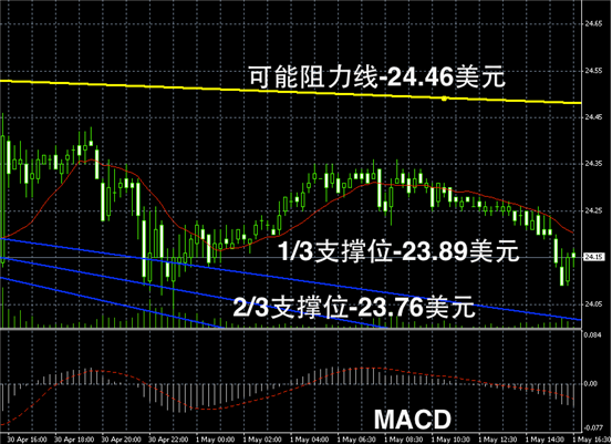 白银阴阳烛录得柱体离散率较大,前后比值差异大,末端柱体低于红色日平均移动线。短线MACD显示弱势空头主导,预期未来或有小幅下行修正空间。