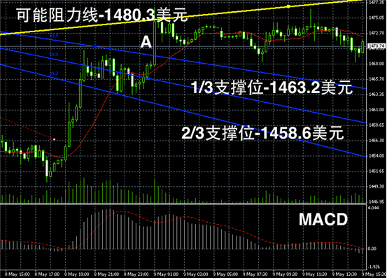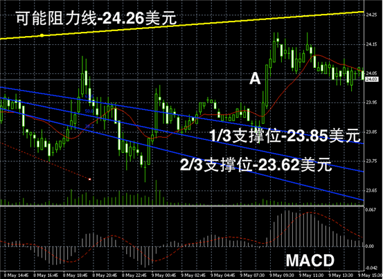 黄金阴阳烛录得上行后,柱体聚焦明显,整体处于红色日平均移动线中位,且短线MACD录得DIF收短,预期短线或窄幅震荡,震荡区间可参考阳烛A的高低价。