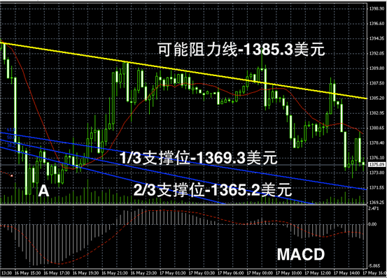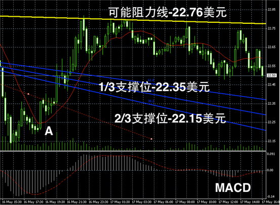 黄金阴阳烛录得后期阴烛增多,且大都低于红色日平均移动线,短线MACD显示空头有回升趋势,预期未来或继续区间下行。低位支撑可首先参考U型反弹时阴烛A的最低价。