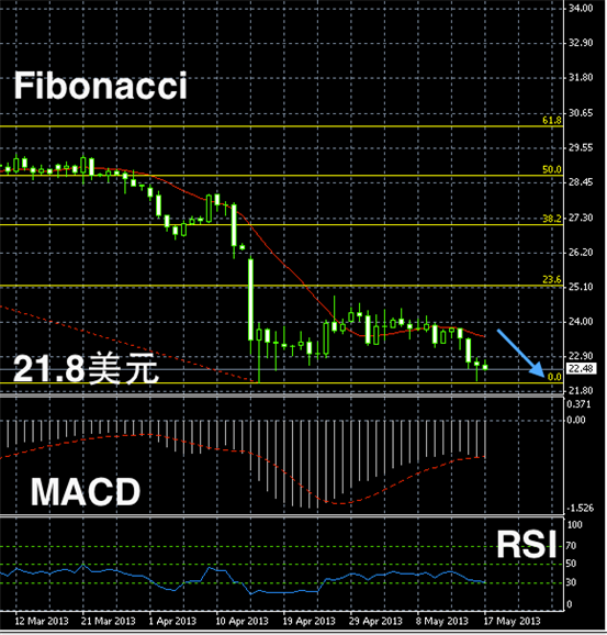 白银长线阴阳烛录得已经探底至Fibonacci低位支撑附近,前MACD和RSI均表现为下行趋势。