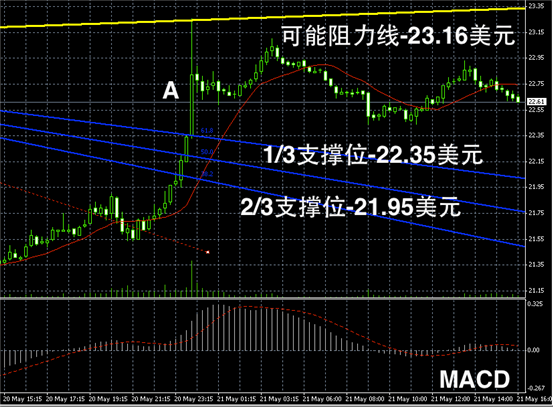 白银阴阳烛录得柱体高低交叉于红色日平均移动线中位,且整体较短,震荡趋势不明显。短线MACD显示多头消散,未来或转为空头趋势。低位支撑可参考阳烛A的最低价。