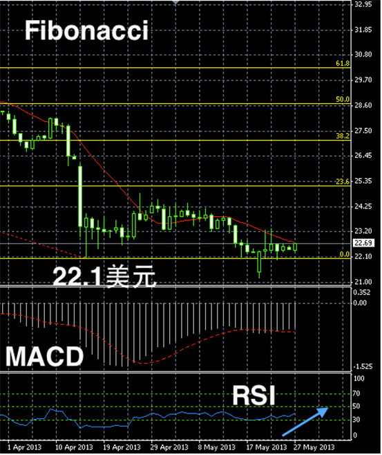 白银长线阴阳烛仍旧相对疲软,红色日平均移动系统整体仍然处于下行趋势,长线MACD显示空头停顿,RSI却在上升趋势,有反弹的动能。整体上白银反弹动力较弱,短线或有小幅上扬,不过很可能不能穿22.3美元/盎司。