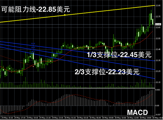 白银长线阴阳烛录得仍旧比较平稳,尽管末端录得长线阳烛,但是柱体较短,且长线MACD空头持稳,RSI反弹趋势不明显。白银或继续在22 – 23 美元区间震荡。