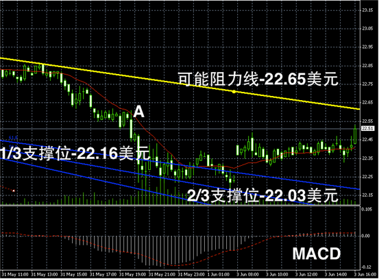 白银阴阳烛录得末端有小幅反弹,柱体开始小幅高于红色日平均移动线,短线MACD显示多头缓慢增加,未来或可能小幅上扬,高位阻力可参考阴烛A的最高价。若突破,则可能继续上行,否则或回落。