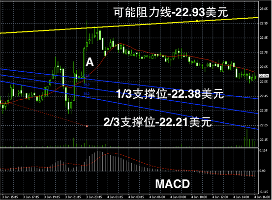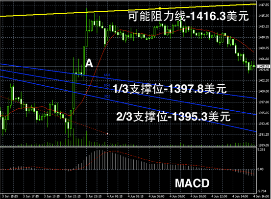黄金阴阳烛录得阴烛增多,且末端开始低于红色日平均移动线,短线MACD转为小幅的空头趋势。不过交易量显示有所上升,未来如果能够守住阳烛A的最低价,即1400美元/盎司支撑位,则可能反弹,否则或继续滑落。