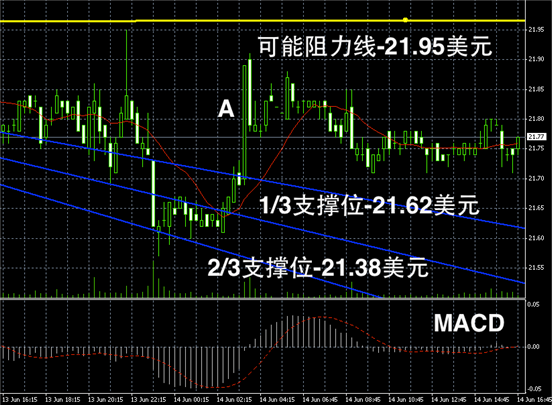 白银浮动在21 – 22 美元区间之后,继续做空头动能积聚,长线MACD有见长趋势,中期仍旧偏空下行,短线或先窄幅震荡。