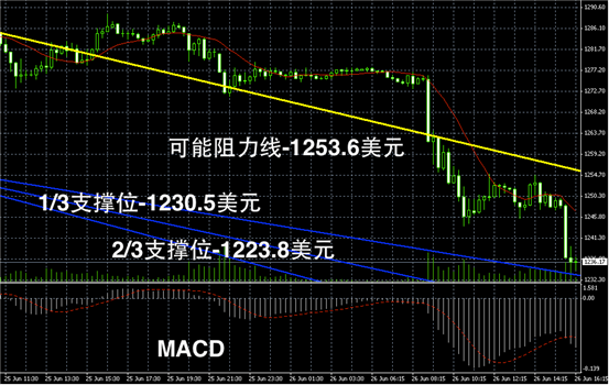黄金阴阳烛录得阴烛增多,且大幅低于红色日平均移动线,短线MACD显示空头积聚明显,预期未来或可能继续走跌,短线低位支撑可首先参考1220美元附近,若美国数据继续向好,黄金可能进一步走跌。