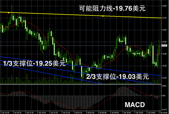 白银阴阳烛录得柱体整体处于红色日平均移动线中位,前后比值差异小,短线MACD多头或空头轮番主导,预期未来或继续在19 – 20 美元区间宽幅震荡。