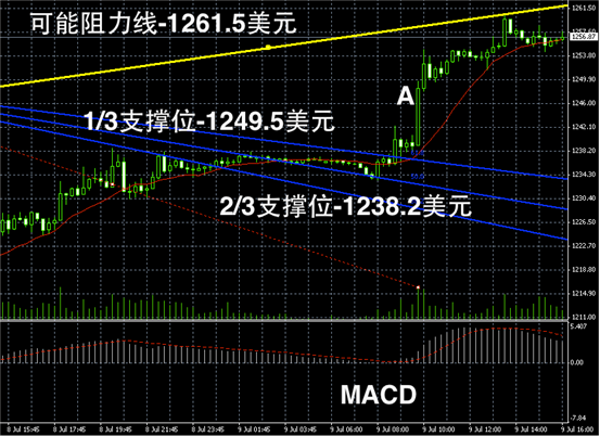 黄金阴阳烛录得反弹后,柱体收短,且整体处于红色日平均移动线中位,显示反弹动力有所消散,短线MACD录得DIF线也有收短趋势,短线或在1250美元附近震荡,低位支撑可参考阳烛A的最低价。