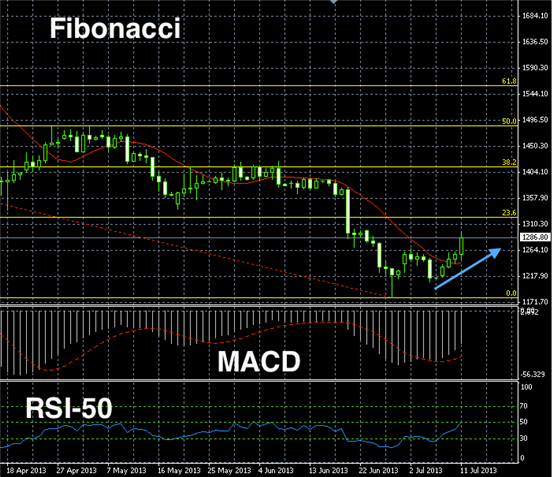 黄金阴阳烛末端录得阳烛大幅高于红色日平均移动系统,且反弹至Fibonacci区间中位,MACD且有继续收短的趋势,RSI则反弹至50,不过由于RSI已经触及50,不在超卖区域,所以黄金价格可能会有所回落,1300美元附近阻力线比较强劲。