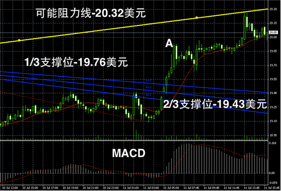 白银长线阴阳烛末端录得长阴烛后,红色日平均移动线仍然反应处于筑底趋势,长线MACD收短趋势不明显,RSI反弹至50后,超卖区域不在,所以白银或浮动在20.3美元上下。