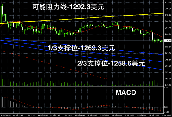 黄金阴阳烛录得柱体小幅低于红色日平均移动线,整体录得阴烛增多,短线MACD显示弱势空头有所回位,预期未来或仍有部分下行空间。