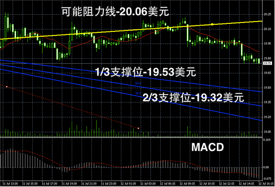 白银阴阳烛录得阴烛增多,且柱体开始低于红色日平均移动线,短线MACD显示空头开始积聚,未来或在19 – 20 美元区间偏空震荡。