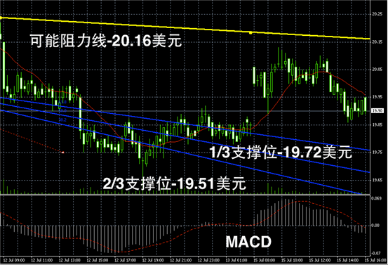 白银阴阳烛录得柱体离散率加大,且末端柱体低于红色日平均移动线,短线MACD显示弱势空头回位,预期未来或仍有部分的下行空间,整体或围绕20美元上下震荡。