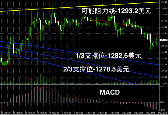 黄金阴阳烛录得中位持稳后,末端开始低于红色日平均移动线,且阴烛开始增多,短线MACD显示弱势空头回位,短线或在1280美元上下震荡。