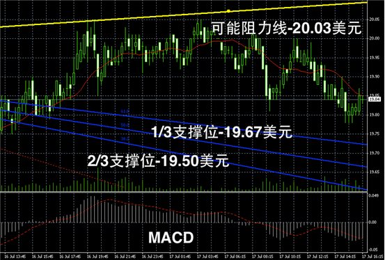 白银阴阳烛录得柱体低于红色日平均移动线,离散率有所加大,短线MACD显示弱势空头主导,预期或继续在19 – 20 美元区间内偏空震荡。